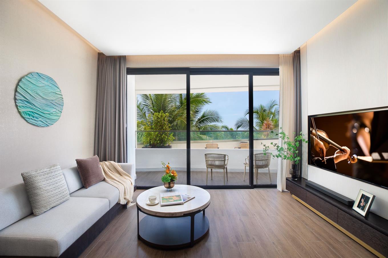 - One Bedroom Executive Suite (2-7 этаж, вид на сад + море, гостиная и спальня, двуспальная кровать, кухня, макс. 3 чел., 78 м2);