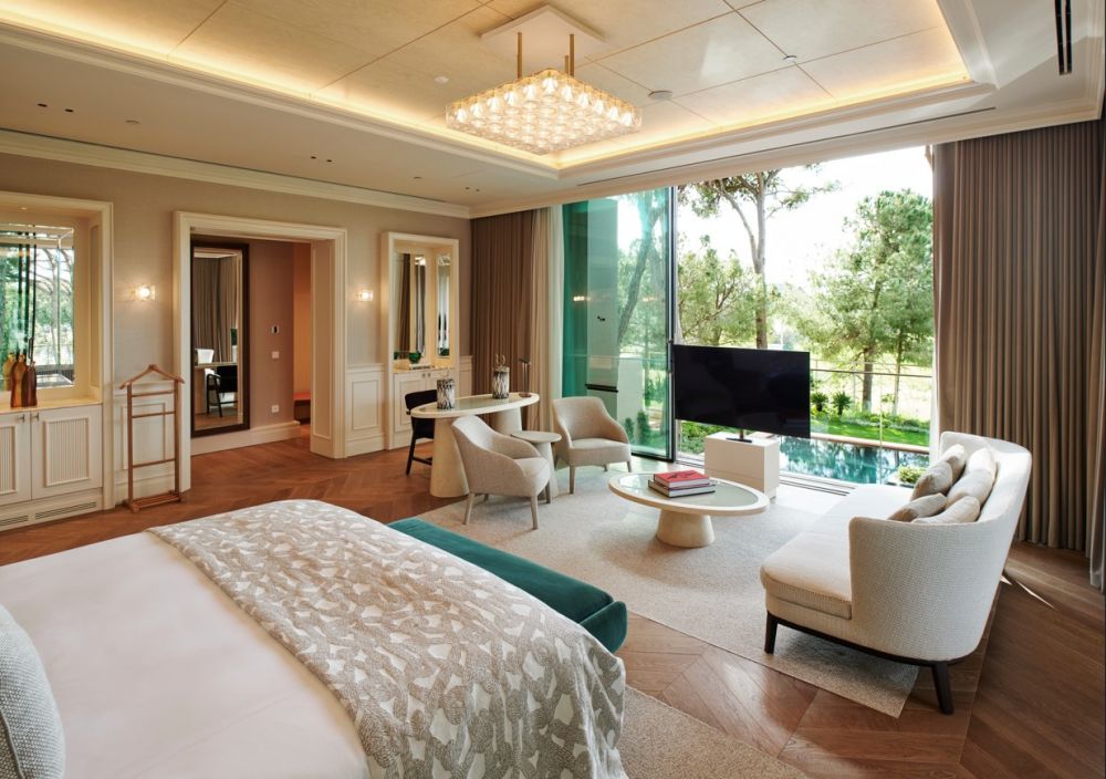 двухуровневая Presidential Villa (расположен в Montgomerie Golf Course, гостиная, обеденная зона, кухня, 4 спальни (3 двуспальные и 2 односпальные кровати), 5 ванных комнат (две с душем, одна с сауной и душем, две с джакузи и душем), турецкая баня, терраса, частный открытый бассейн 60 м2 (с подогревом в зимний период), макс. 12 чел.+инф, 630 м2 (внутри 495 м2), привилегии);