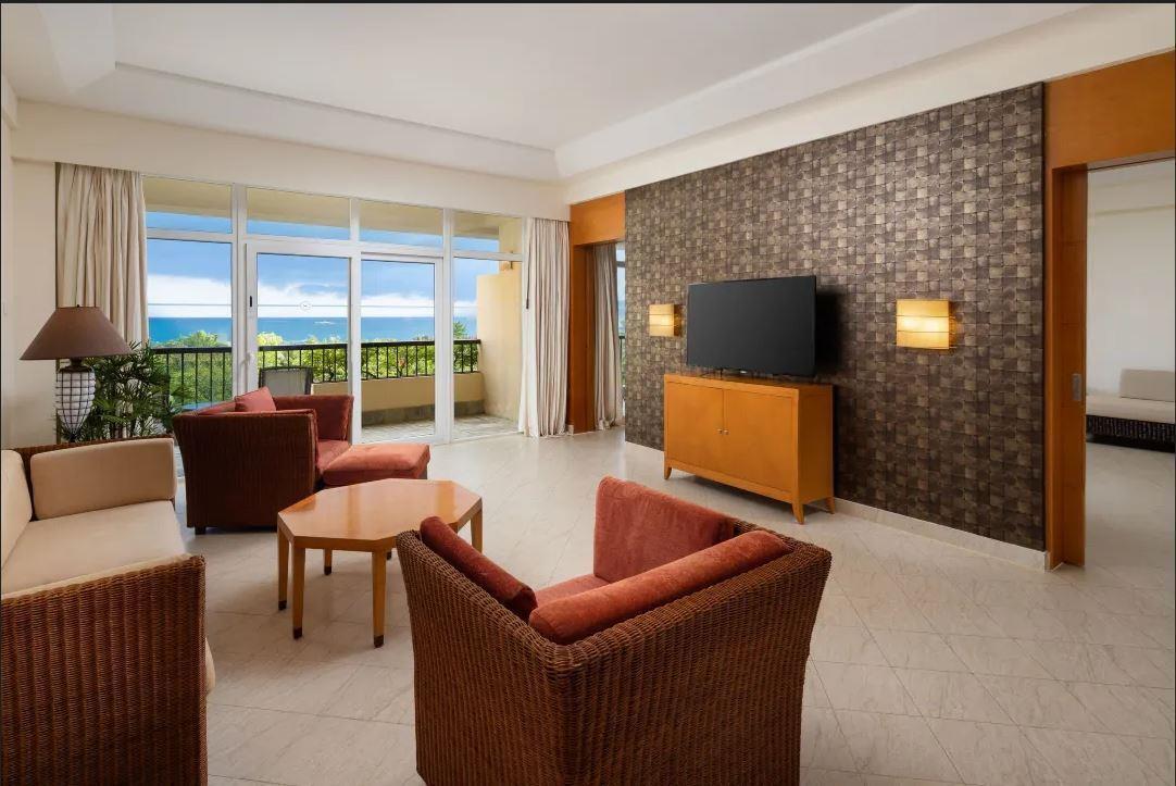 - Sea View Suite (5–7 этажи, с видом на сад и море, гостиная и спальня, двуспальная кровать, балкон, макс. 3+1 чел., 118 м2);