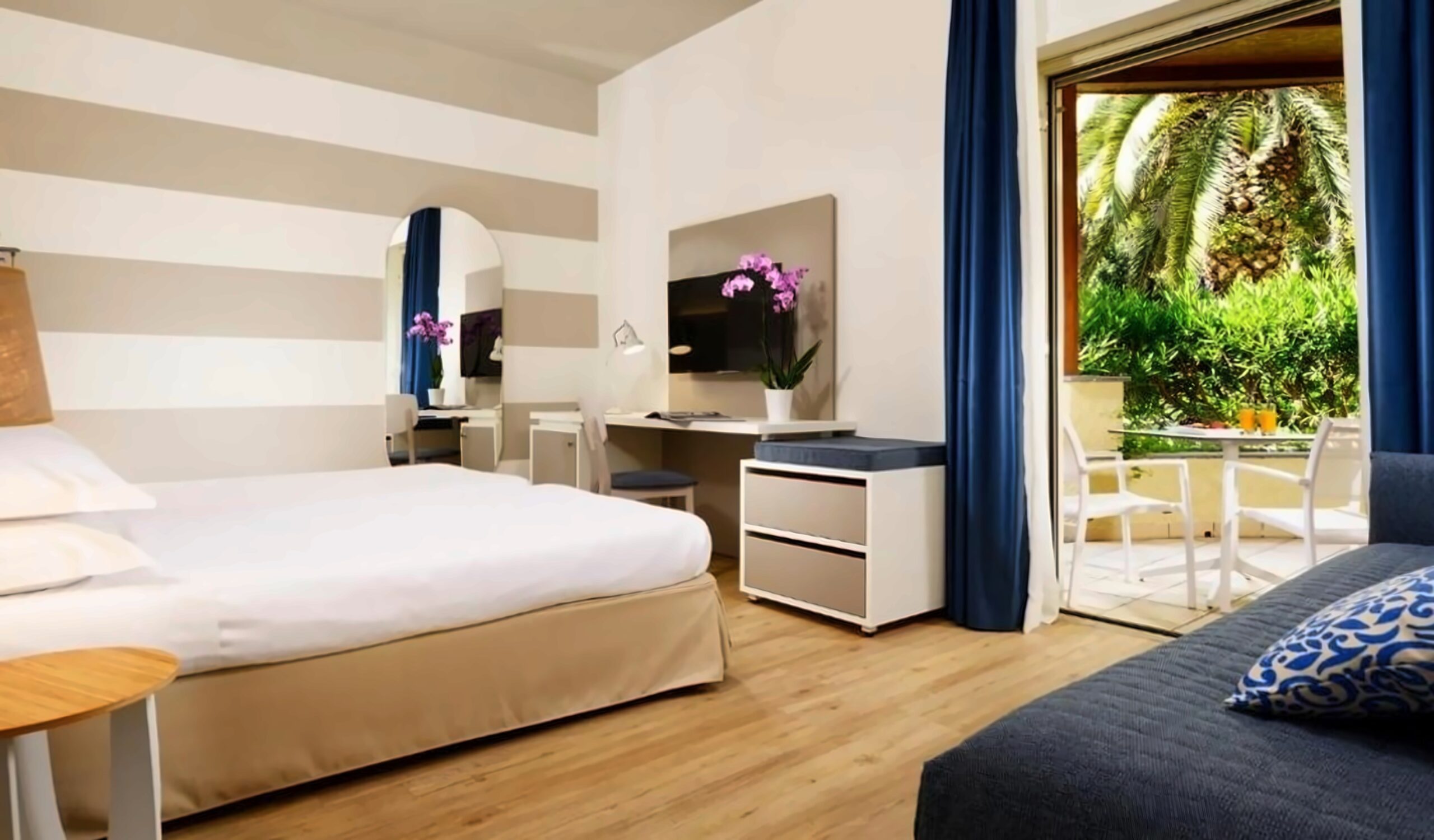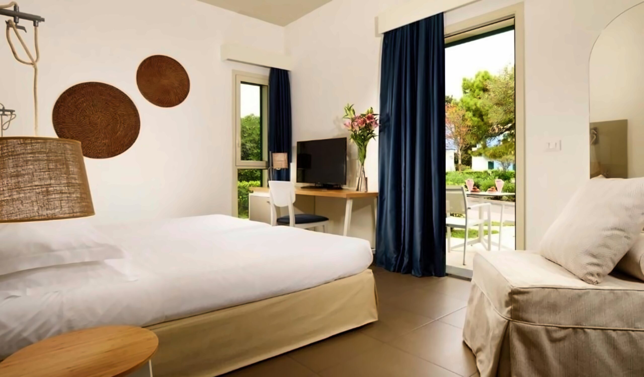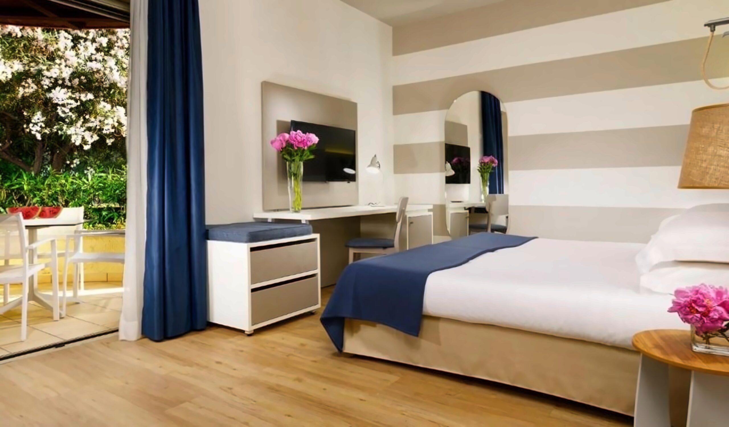 Family Room Superior Villa (ок. 32 м2, на мин/макс 2 взр.+2 реб 3-12 лет; полностью обновлены; спальня с двуспальной кроватью и детская спальня с двумя кроватями, терраса с выходом в сад или балкон. В ВИЛЛАХ ВИД НА МОРЕ НЕВОЗМОЖЕН)